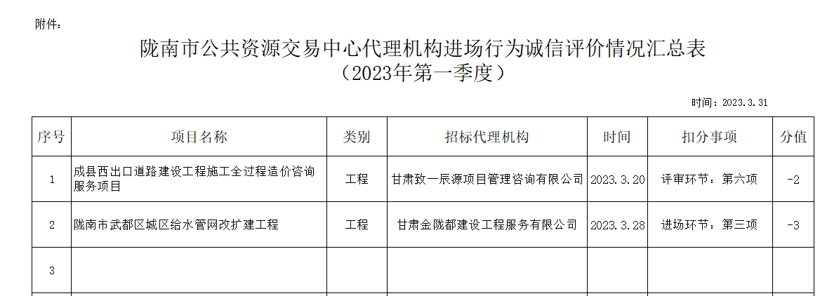 根據(jù)《甘肅省公共資源交易代理機構(gòu)管理辦法》(甘政辦發(fā)〔2019〕107號)和《隴南市公共資源交易中心代理機構(gòu)進(jìn)場行為誠信評價實施制度(試行)》規(guī)定,現(xiàn)對2023年第一季度,共2家代理機構(gòu)2條進(jìn)場行為誠信評價記錄予以通報(詳見附表)。請各代理機構(gòu)嚴(yán)格遵守各項規(guī)章制度、誠實守信,規(guī)范操作,為招標(biāo)人和采購人提供專業(yè)、高效、規(guī)范的招標(biāo)代理服務(wù)。