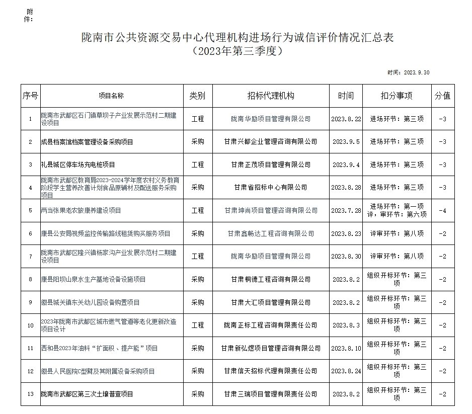 隴南市公共資源交易中心關(guān)于2023年第三季度代理機構(gòu)進場行為誠信評價結(jié)果的公示