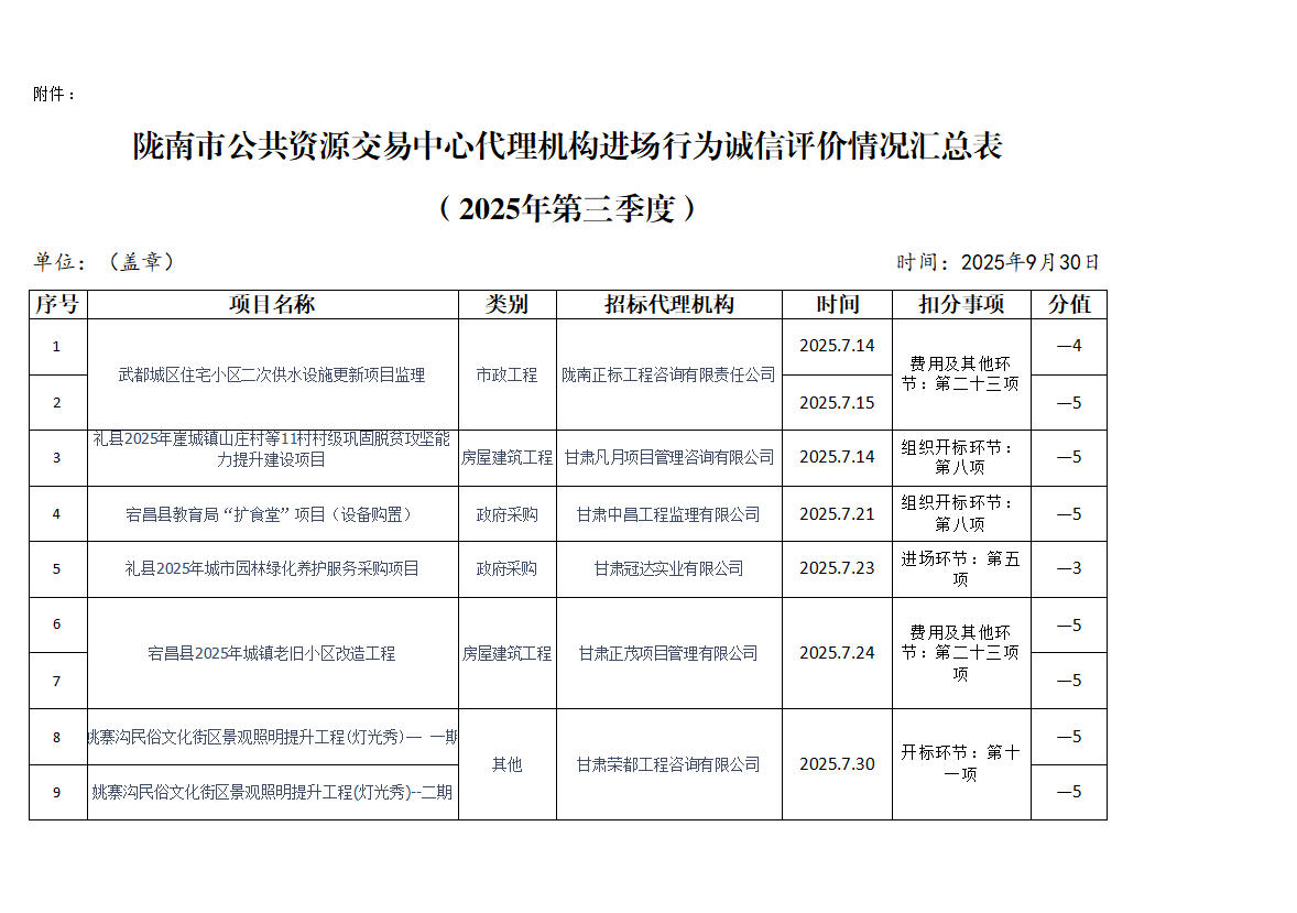 隴南市公共資源交易中心關(guān)于2025年第三季度代理機(jī)構(gòu)進(jìn)場行為誠信評價結(jié)果的公示