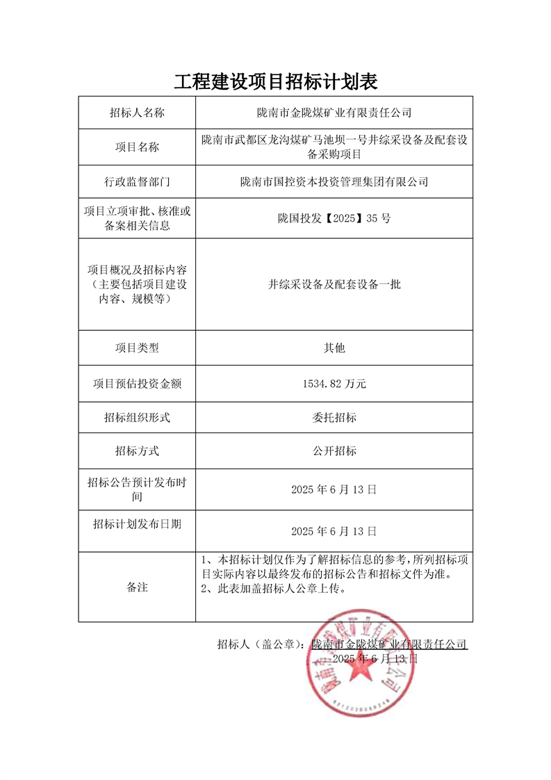 隴南市武都區(qū)龍溝煤礦馬池壩一號(hào)井綜采設(shè)備及配套設(shè)備采購項(xiàng)目