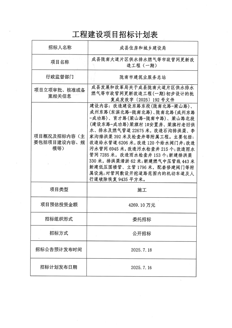 成縣隴南大道片區(qū)供水排水燃?xì)獾仁姓芫W(wǎng)更新改造工程(一期)