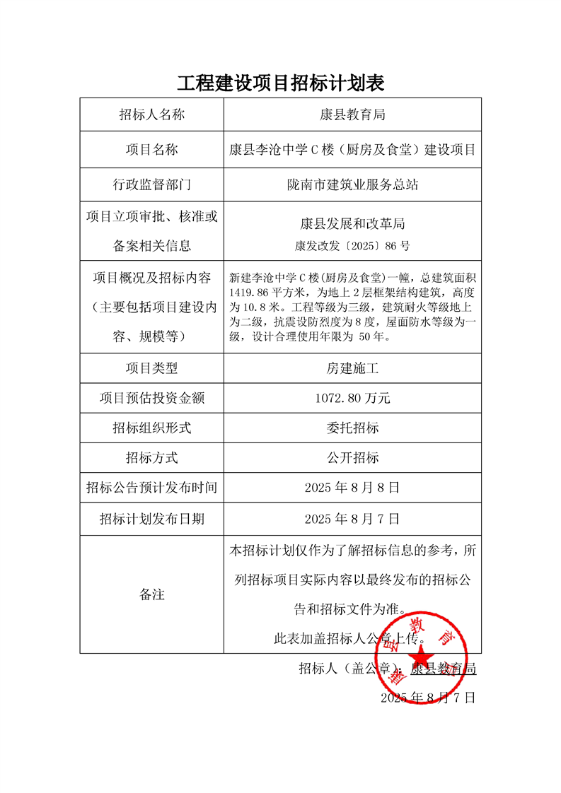 康縣李滄中學(xué)C樓(廚房及食堂)建設(shè)項目