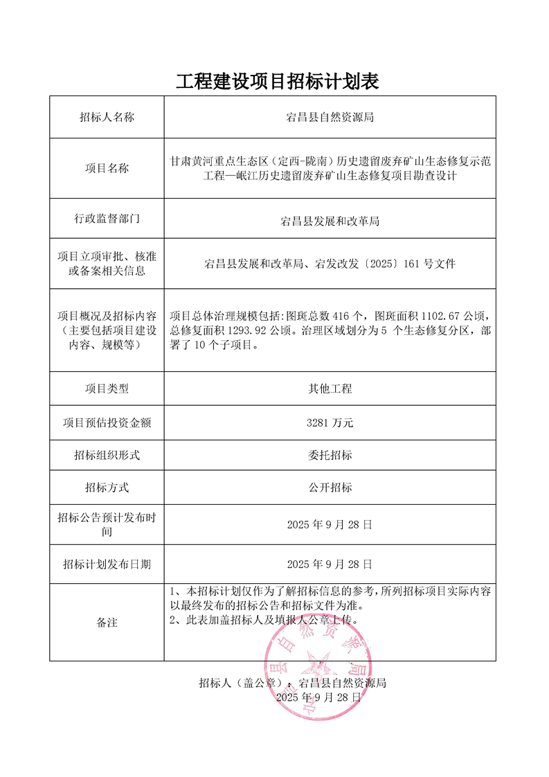 附件:工程建設(shè)項(xiàng)目招標(biāo)計(jì)劃表甘肅黃河重點(diǎn)生態(tài)區(qū)(定西-隴南)歷史遺留廢棄礦山生態(tài)修復(fù)示范工程—岷江歷史遺留廢棄礦山生態(tài)修復(fù)項(xiàng)目勘查設(shè)計(jì).pdf
