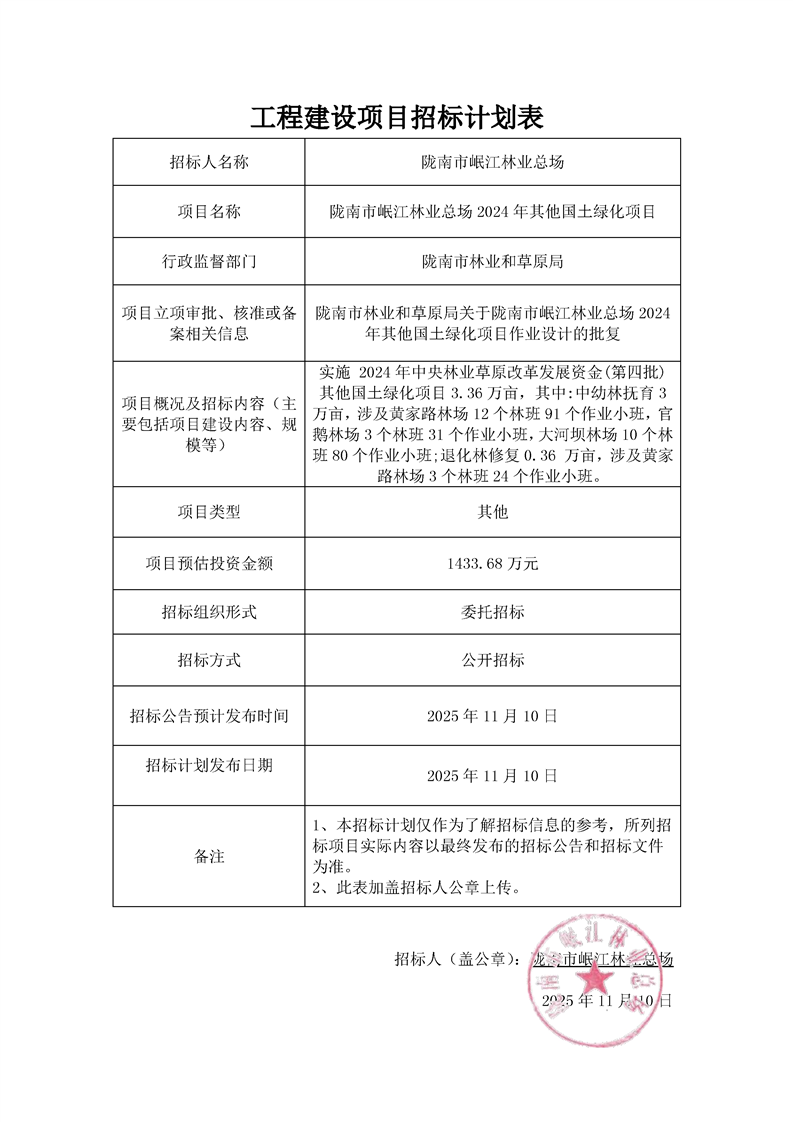 隴南市岷江林業(yè)總場(chǎng)2024年其他國(guó)土綠化項(xiàng)目