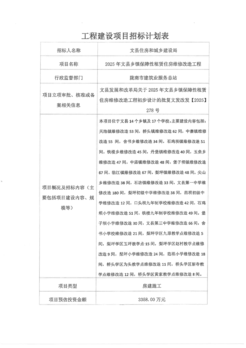 2025年文縣鄉(xiāng)鎮(zhèn)保障性租賃住房維修改造工程